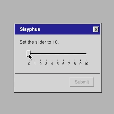 Let’s Play: Ancient Greek Punishment: UI Edition 2019Game Apr 12 Written By Elizabeth Erana Pippin Barr Let’s Play: Ancient Greek Punishment: UI Edition Sliders! Radio buttons! Dialog boxes! Menus! Progress bars! These are the instruments of our eternal contemporary torment! The ancient Greek gods would have approved! We are all Sisyphus now!External Site here.PLAY Online here. Elizabeth Erana
